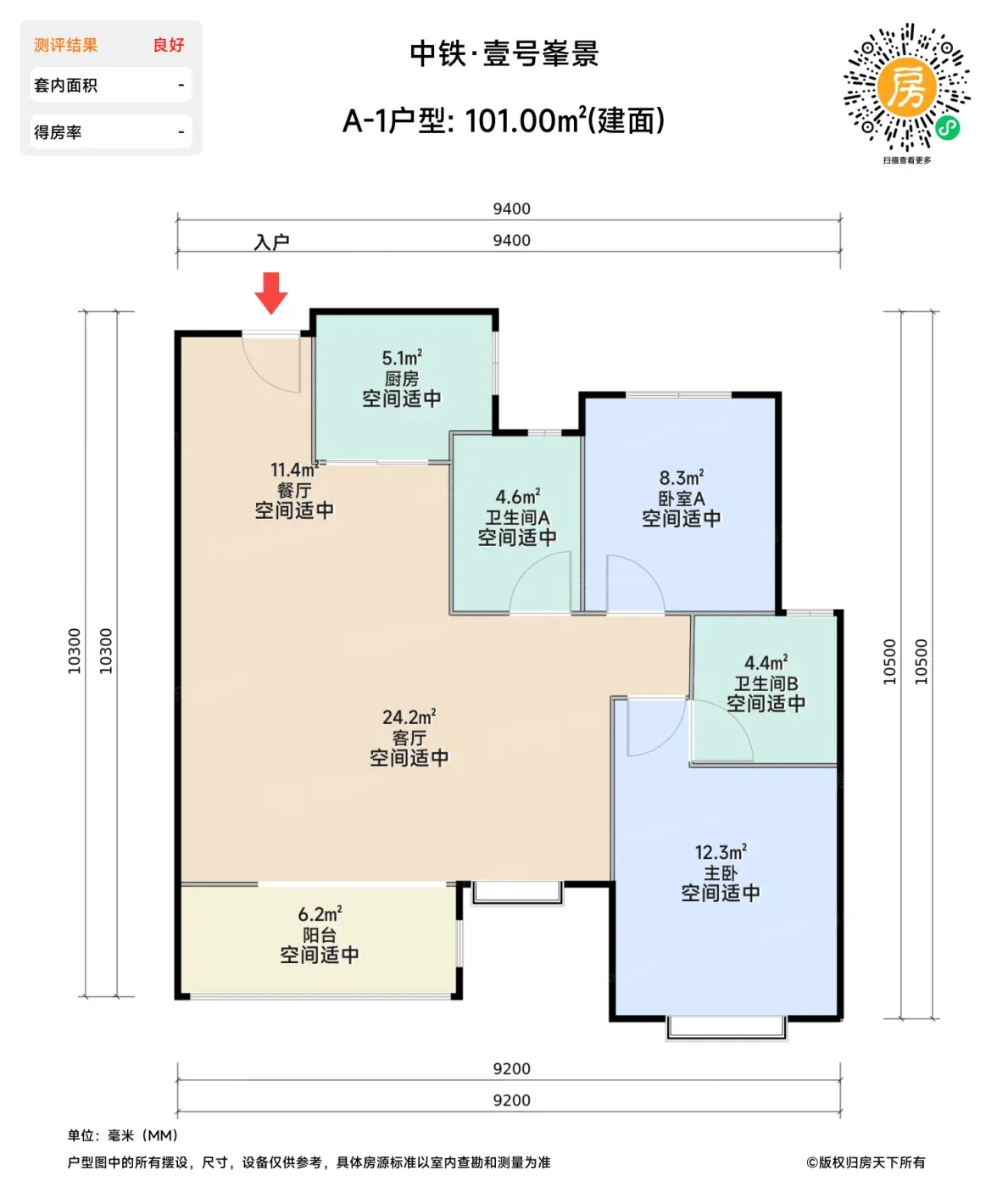 ▫️101㎡户型次卧进深仅2.6米,放完1.5米床只剩过道空间(实测铺完地暖更显局促)