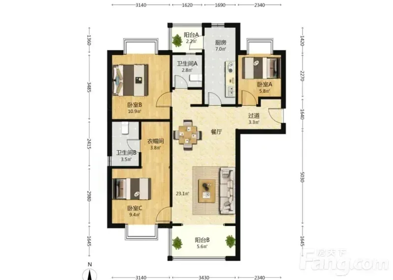 1️⃣ 105㎡正经大三房,全家住着超级宽敞!主卧放1.8米大床还有多余空间~