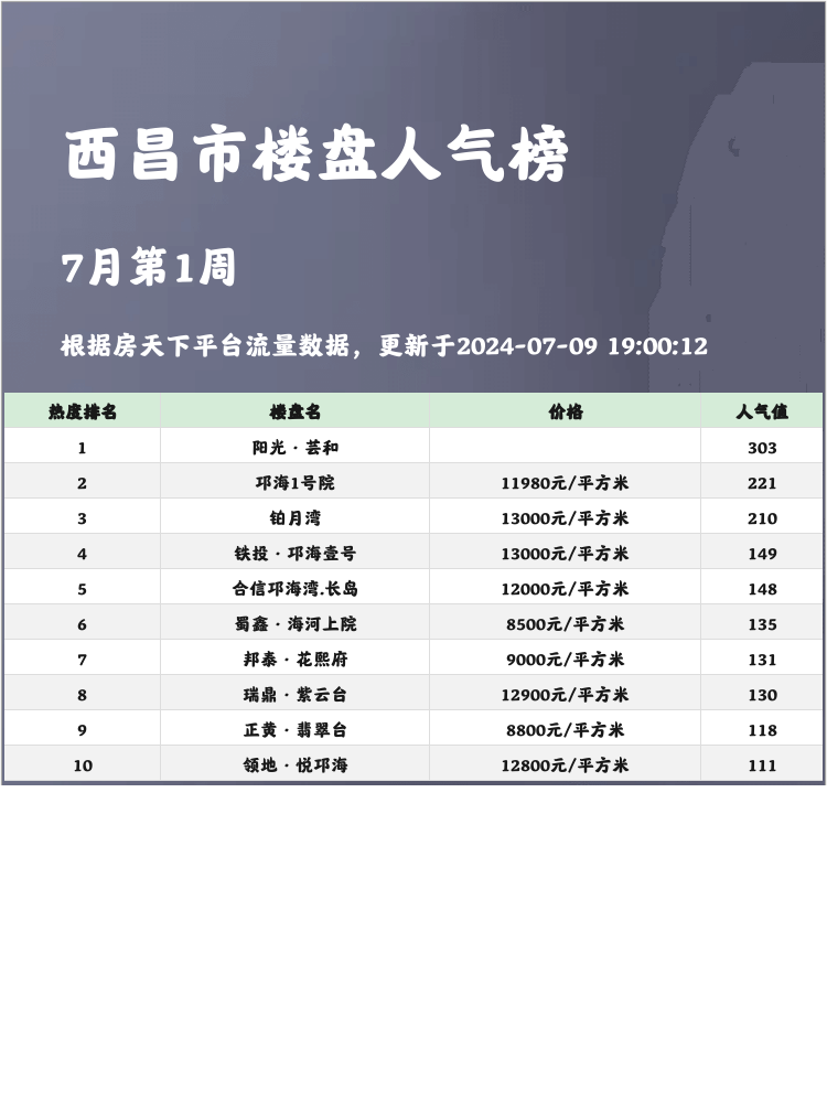 📢 买房路上挑花眼?看这里!人气楼盘榜单来帮你!在购房时,了解楼盘热度和优势至关重要👍。尤其是在竞争激烈的市场中,选择人气楼盘不仅意味着优质的居住环境,还可能带来良好的升值空间💹。今天我们来看看西昌市人气楼盘榜单的前三名,给你购房决策更多的参考信息!
