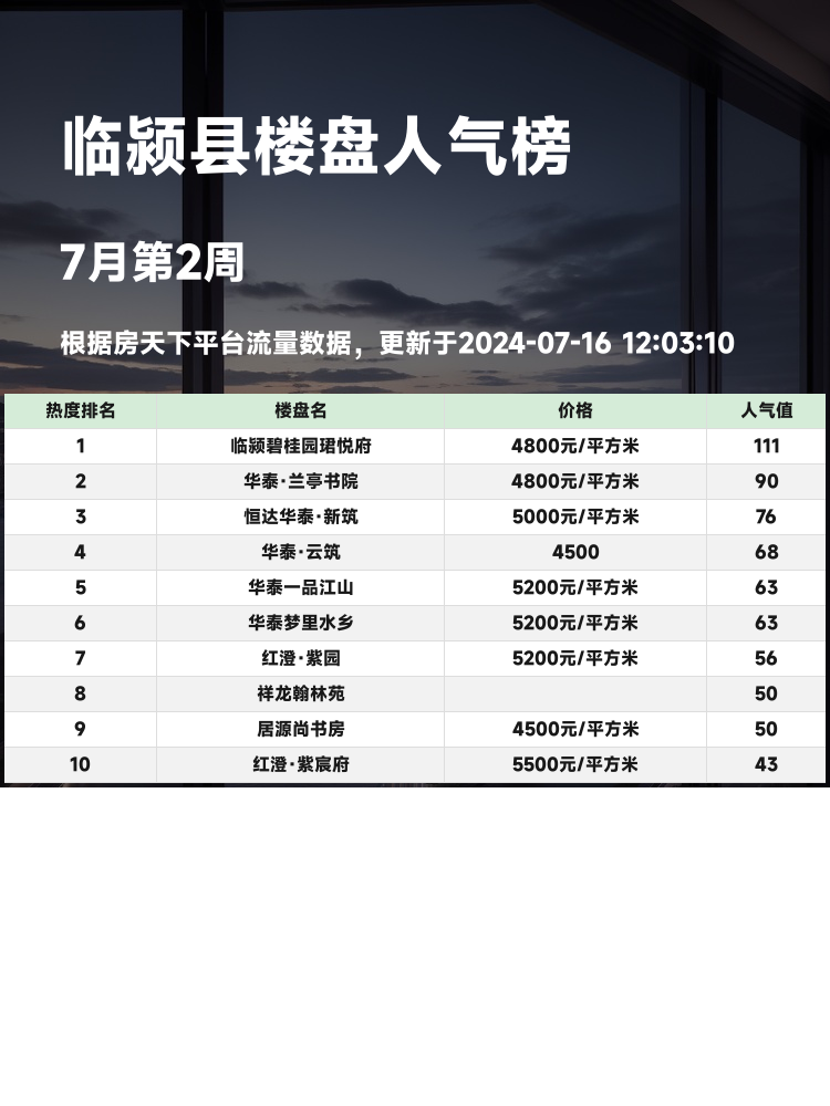 买房选房是人生中的大事,不仅关系到居住的舒适度,更影响到生活的便利性和投资的回报率。关注人气楼盘榜单,可以帮助购房者快速筛选出优质楼盘,了解市场热点,找到最适合自己的房源。今天就带大家看看临颍县的热门楼盘榜单!