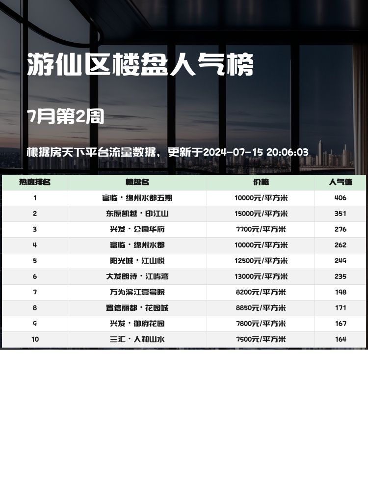 各位小伙伴们,游仙区的人气楼盘榜单新鲜出炉啦!希望这篇测评资讯能给你们带来一些购房的灵感和参考。赶紧来看看你最心仪的楼盘吧!😍🔑