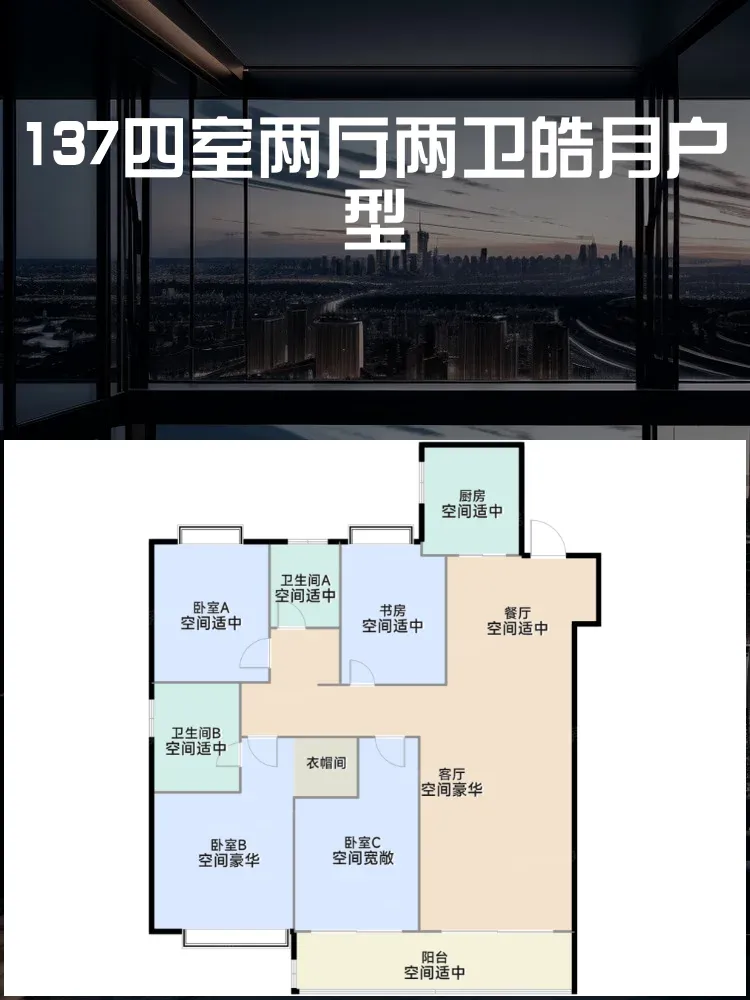 137平四室两厅两卫的皓月户型: