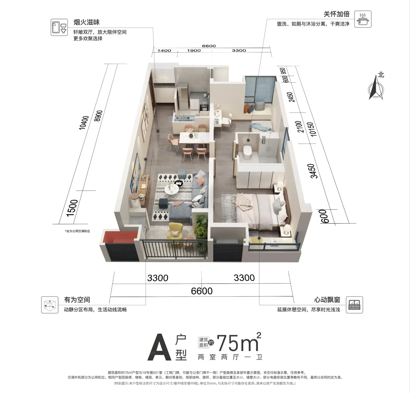 3. 户型暗藏小心机:75㎡做三房,主卧竟然塞得下婴儿床+梳妆台,实测柜体深度比常规多5cm