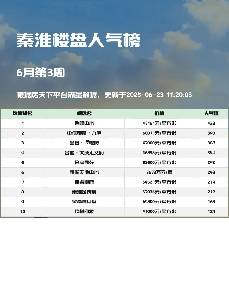 买房选对区域很重要,但同区域内楼盘差异也不小!这份秦淮区人气榜单帮你快速锁定优质盘✨当前市场下,交通便利+教育资源+户型实用才是王道,快来看看TOP3楼盘的真实表现👇