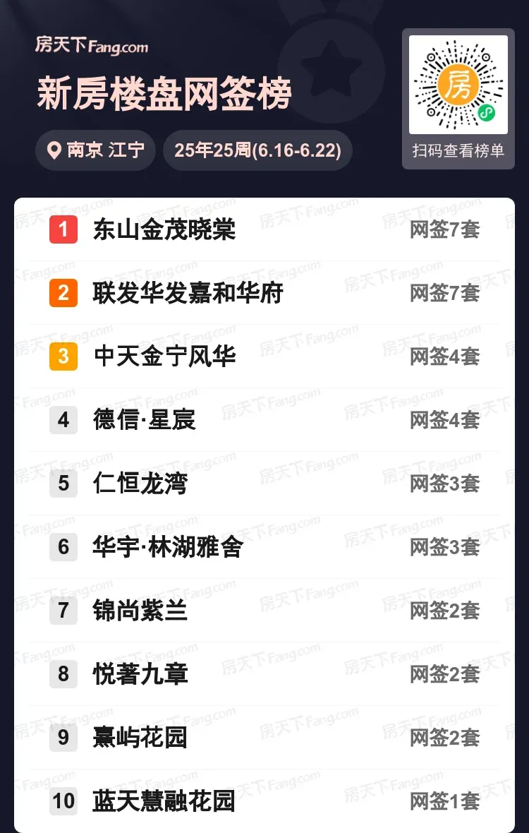 上周江宁新房市场再掀波澜,网签榜前十强正式揭晓!令人瞩目的是,东山金茂晓棠与联发华发嘉和华府双双以7套成交量强势并列榜首,中天金宁风华和德信·星宸紧随其后各成交4套,仁恒龙湾、华宇·林湖雅舍等改善型项目也稳定发力。