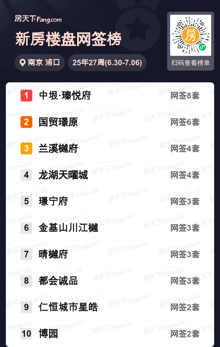 上周浦口新房市场出现明显分化,中垠·瑧悦府以8套成交强势领跑,成为当之无愧的流量担当,国贸璟原紧随其后斩获6套。值得关注的是,金基山川江樾、晴樾府等品质项目稳定在第二梯队,持续释放市场购买力。从成交结构来看,改善型产品占比超六成,精装现房和低密产品更受买家青睐。随着下半年主城土地供应缩减,这类地段优质项目或将迎来新一轮热度。