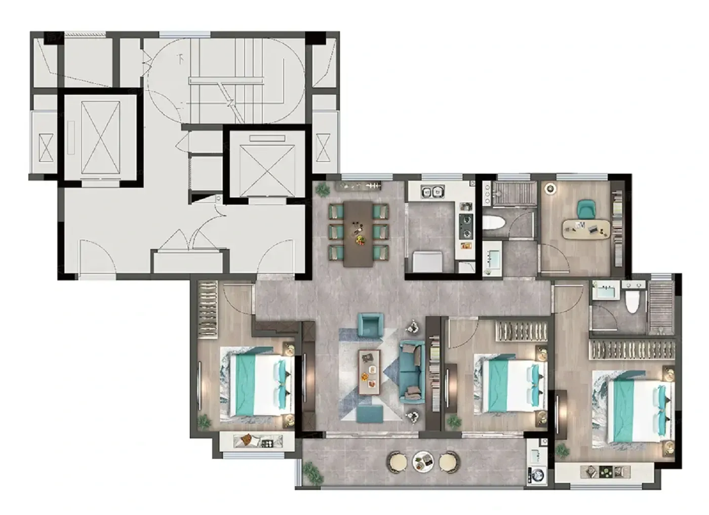 先说主卧的3分离设计:早起洗漱区/更衣区/睡眠区互不干扰,配上自带mini水吧的飘窗,彻底终结「抢卫生间大战」。更绝的是南北双阳台系统:家政区藏在北面,南面大阳台直接对焦体育公园景观,晾衣杆存在的意义突然消失了...