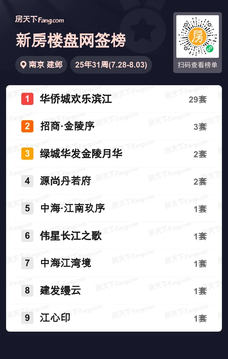 上周建邺新房市场出现戏剧性分化!华侨城欢乐滨江以29套成交量一骑绝尘,相当于后九名楼盘总量3倍有余。河西中轴滨江盘的虹吸效应持续放大,29套成交不仅创下近月新高,更包揽区域64%市场份额。招商金陵序以3套位列第二梯队,绿城华发、源尚丹若府各成交2套勉强撑场。值得关注的是,5万+/㎡改善盘普遍遇冷,中海、建发等高端项目仅录得零星成交。预测下半年核心地段头部效应加剧,非核心区项目或将加大促销力度。看过欢乐滨江的朋友来说说实勘体验?
