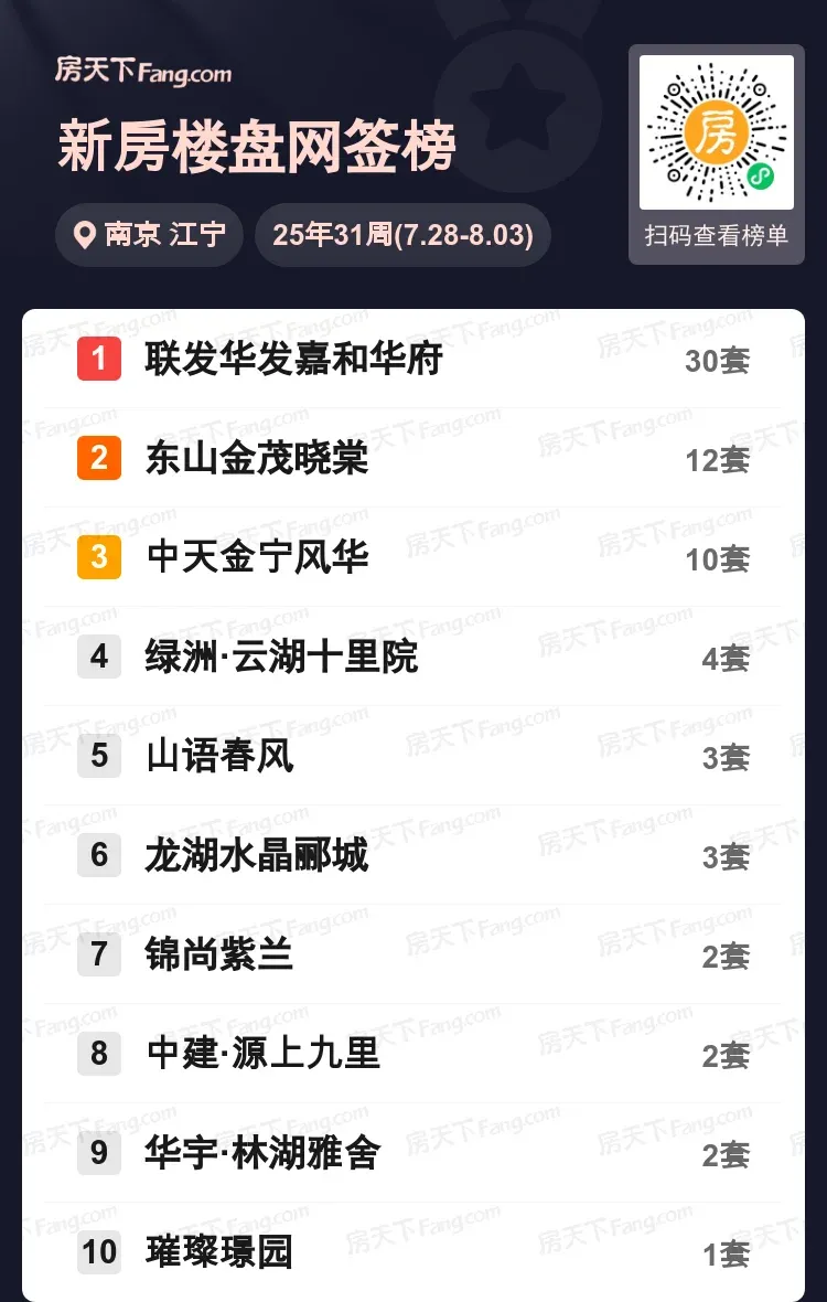 江宁楼市这周被联发华发嘉和华府刷屏了!单周30套的网签数据直接甩开第二名两倍多,这个位于方山脚下的改善盘正在用实打实的成交量改写区域格局。前十榜单中,东山金茂晓棠以12套稳居第二梯队,中天金宁风华以10套成为刚改市场新宠。