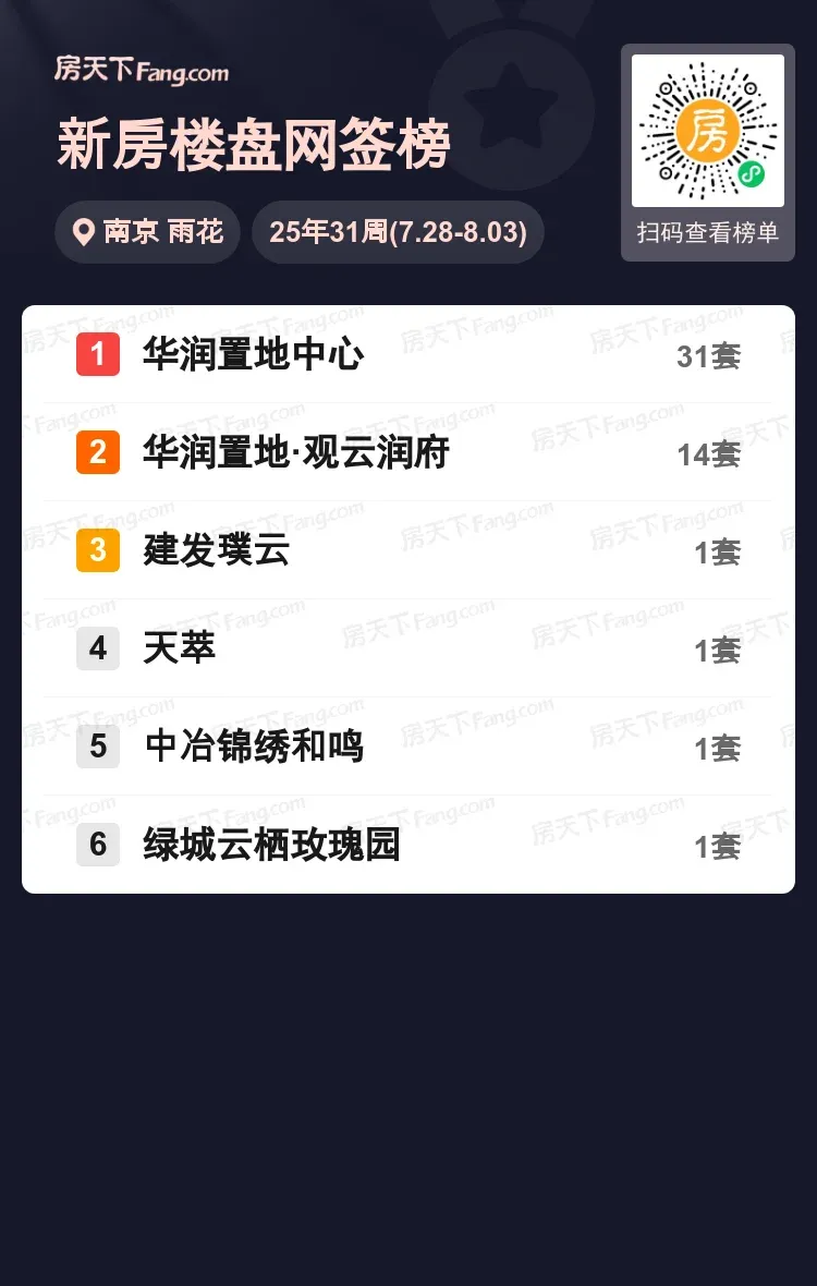 当其他楼盘还在个位数挣扎时,华润置地中心以31套成交的绝对优势占据榜单C位。数据显示,前六强中仅前三甲成交量突破两位数,观云润府14套紧随其后,其余项目均在1套徘徊。分析人士认为,核心地段项目持续高热,开发商集中火力打造的品质项目更易突围。