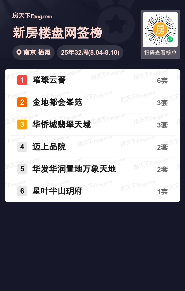 上周栖霞新房市场暗流涌动,榜单前三位竞争尤为激烈!黑马「璀璨云著」以单周6套网签数据强势夺魁,成为片区现象级热盘。深耕区域的金地都会峯范与华侨城翡翠天域以3套成交量并列次席,迈上品院、华发华润置地万象天地紧随其后。值得关注的是,低密产品星叶半山玥府也跻身榜单,显示出改善需求正在逐步释放。