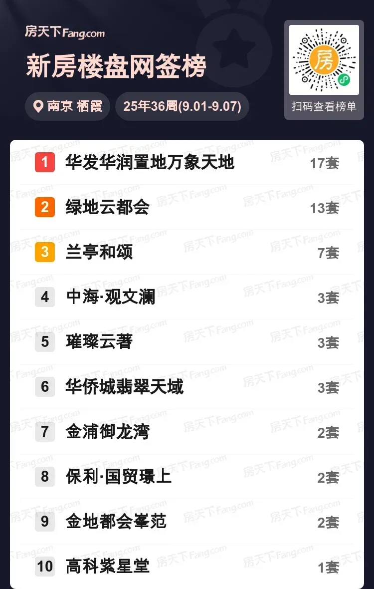 南京楼市的热浪仍在这片科创高地翻涌!上周栖霞网签数据显示,华发华润置地万象天地以17套成交领跑,绿地云都会13套紧追其后,这两大项目已连续多周稳居第一梯队。值得关注的是兰亭和颂以7套成绩跻身第三,成为改善群体的新宠。