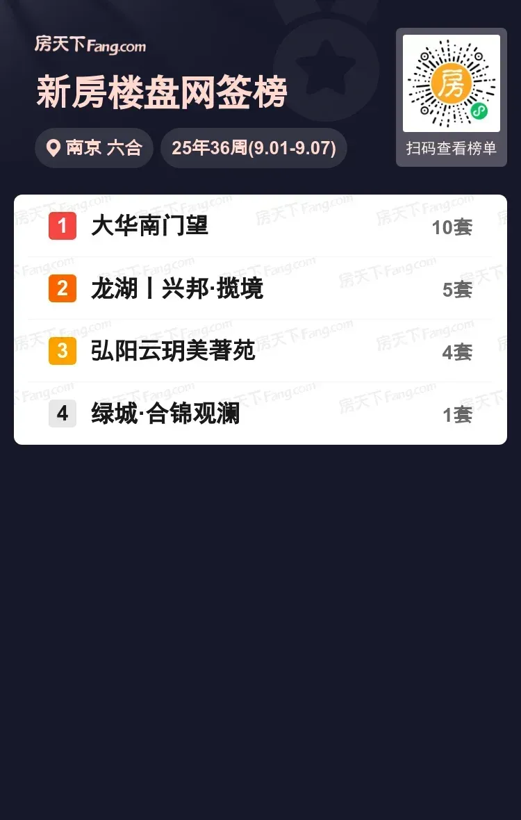 从数据看,大华南门望延续了持续领先态势,单周超半数的成交量印证项目在区域内的独特竞争优势。其他三个项目虽成交稳定,但梯队分化明显。考虑到近期房贷利率调整等利好政策持续释放,预计六合刚需市场将迎来新一波热度。