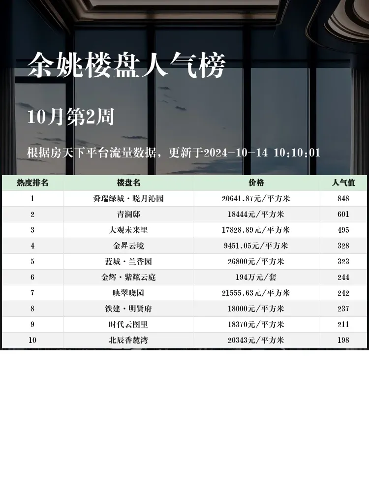 在当前的楼市中,选择一个合适的楼盘不仅关系到居住的舒适度,更是对未来资产的有力保障📈。了解人气楼盘榜单,可以帮助您快速聚焦市场上的热门选择🔥,找出那些既符合预算又拥有优质配套的楼盘🏡。让我们一起看看余姚的热门楼盘都有哪些值得关注的亮点吧👇。