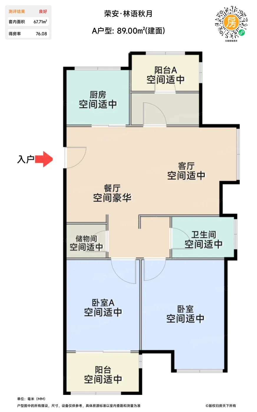 ✔️89㎡户型堪称「空间魔术师」,实测层高2.85米配全景阳台