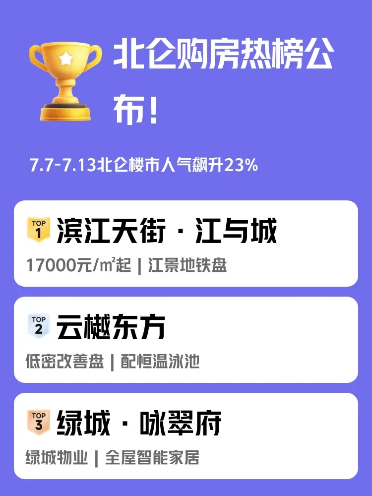 上周(7.7-7.13)北仑楼市惊现购房热潮🔥 区域人气值飙升23%!当996打工人在早晚高峰挤成沙丁鱼时,这三个楼盘业主却在阳台悠闲喝咖啡☕ 快看人气TOP3真香现场👇