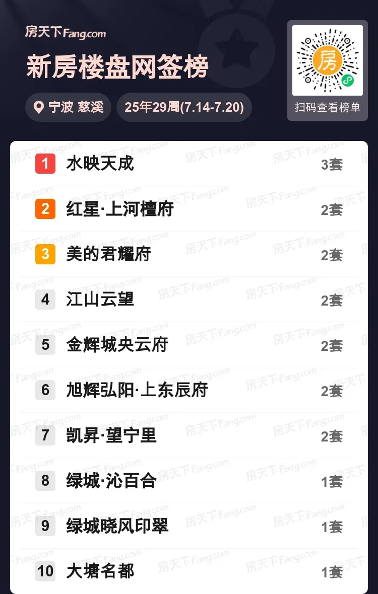 慈溪楼市最新周报新鲜送达!第29周网签数据显示,水映天成以3套成交领跑区域市场,红星·上河檀府、美的君耀府等7个项目以2套成交紧随其后,绿城系产品与大塘名都也跻身榜单前十。从成交分布看,改善型产品与核心区位项目更受市场青睐,购房者出手趋于理性。预计下半年慈溪楼市将延续稳健走势,配套成熟、性价比突出的项目或持续走热。小伙伴们更看好哪个区域的发展潜力?欢迎分享你的置业观点~