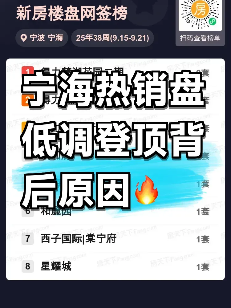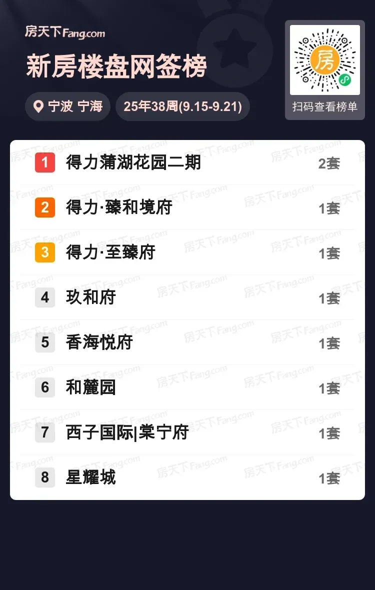 宁波宁海新房市场平稳运行,最新成交数据透露新趋势!上周(9.15-9.21)区域网签TOP10榜单中,得力蒲湖花园二期以2套成交位列榜首,成为唯一突破个位数成交的楼盘。紧随其后的臻和境府、至臻府等7个优质项目各成交1套,整体市场呈现多盘均衡竞争态势。