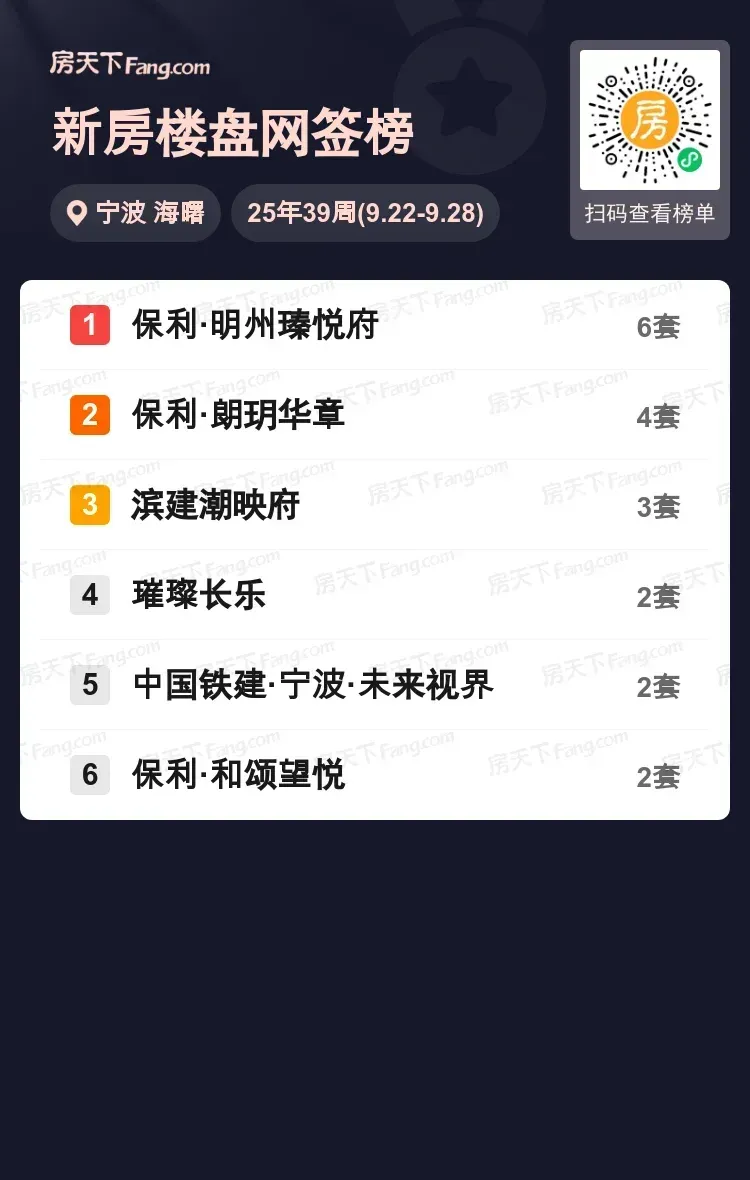 宁波海曙上周楼市有点热闹,保利三大楼盘联手承包成交前三!明州瑧悦府以6套成交量稳坐头筹,朗玥华章4套紧随其后,和颂望悦也强势上榜。滨建潮映府、中国铁建未来视界等品质项目持续发力,购房者用真金白银投出心仪选择。随着主城核心地段房源持续放量,改善型客户可要盯紧这些高性价比项目了!你在看哪个盘?快来聊聊你的购房偏好吧~