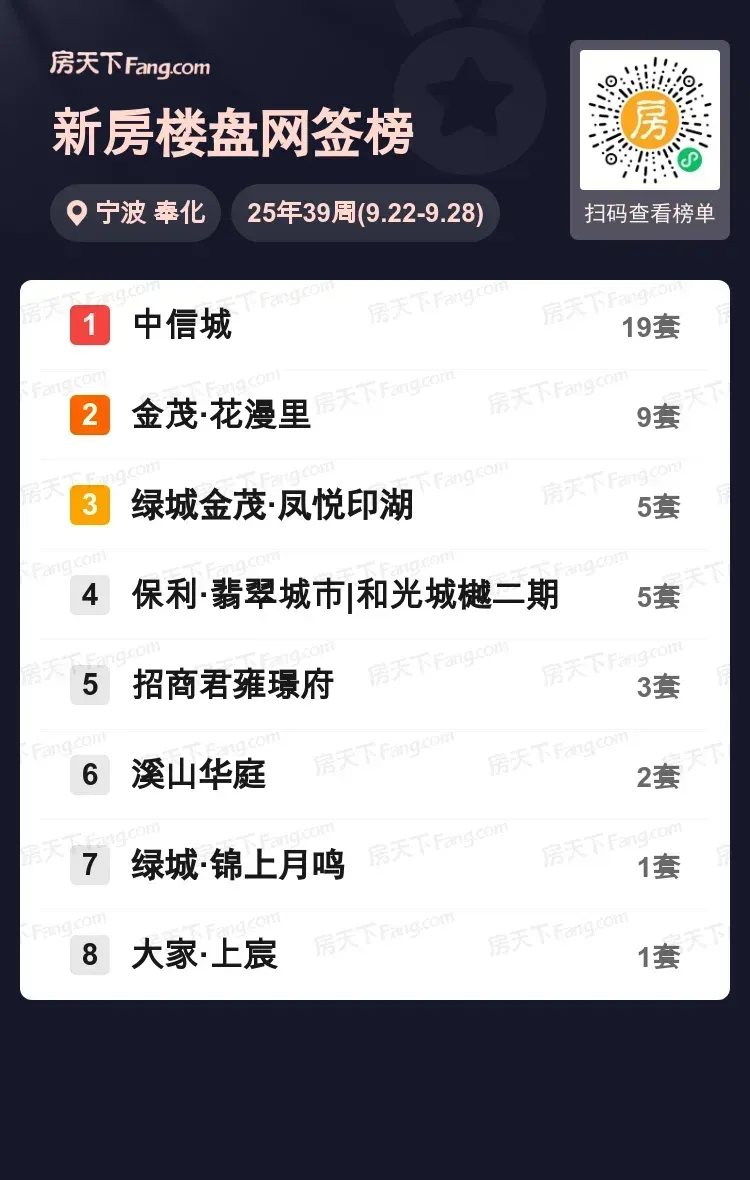 上周宁波奉化楼市持续升温,中信城以19套网签量强势登顶,几乎是第二名金茂·花漫里(9套)的两倍业绩。值得关注的是,绿城金茂·凤悦印湖和保利·翡翠城市两大改善盘首次杀入前三,双盘各斩获5套成交量。