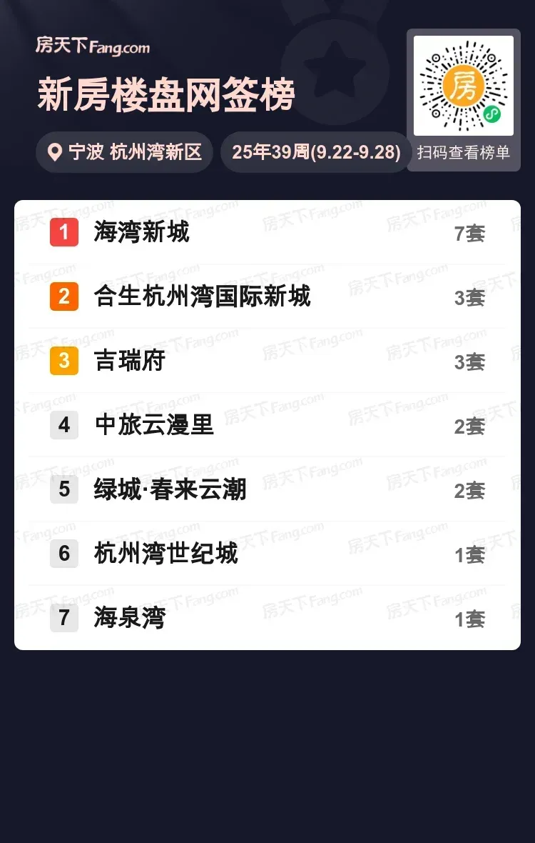 宁波置业热潮持续蔓延,杭州湾新区上周网签榜单新鲜出炉!海湾新城以绝对优势稳坐头把交椅,7套成交成绩单印证市场认可度。合生与吉瑞府各斩获3套形成第二梯队,中旅云漫里、绿城项目则以2套成绩展现稳定实力。