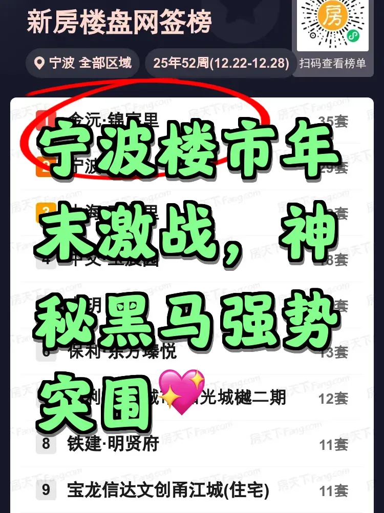 年末最后一周宁波楼市暗流涌动,金沅·锦宸里突然发力签约35套强势登顶,成为年度压哨选手。宁波瑞云以29套紧随其后,中海·富華里守住前三甲。值得关注的是,榜单中多个项目成交咬得极紧,从22套到11套形成密集梯队。观察近期备案节奏,部分开发商可能在年终考核前集中释放签约量,但购房者真实需求仍待观察。你认为这种冲刺态势会延续到新年吗?留言区聊聊你的看法。