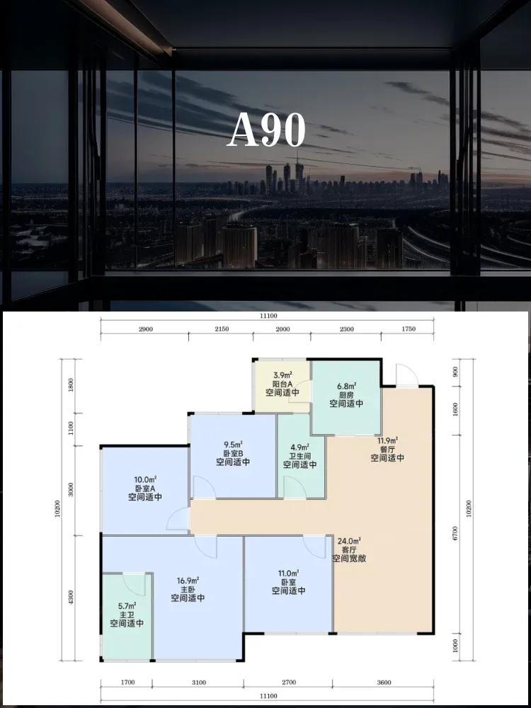 ▫️极致空间利用率:5.8米超大横厅连通景观阳台,主卧+三间次卧全明设计,90㎡竟实现独立家政间!