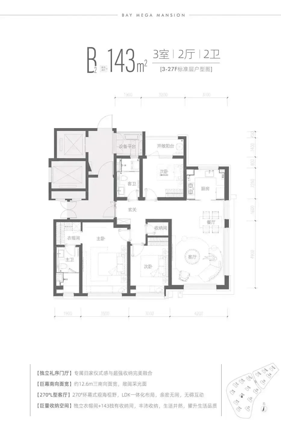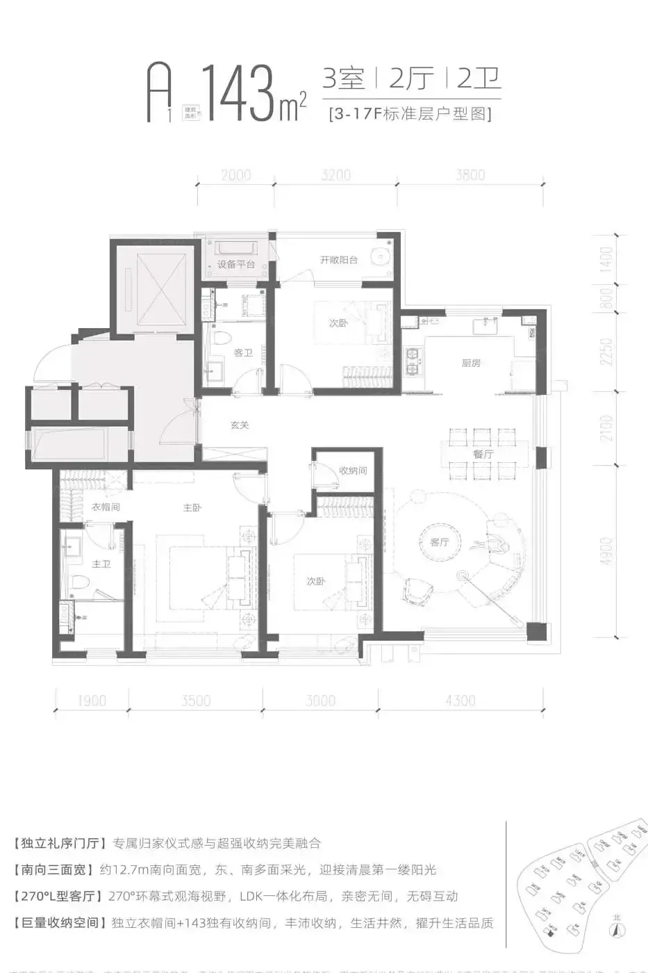 2. 143㎡得房率比同面积段高出7%,双套房设计+独立家政间,青岛改善家庭想要的体面和实用全拿捏;