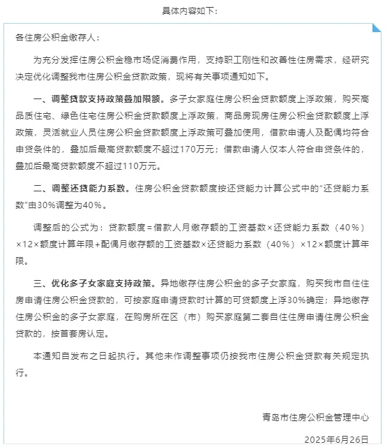 6月26日,青岛市住房公积金管理中心发布关于优化调整住房公积金贷款政策的通知,包括调整最高贷款额度170W、还贷能力系数调整为40%、优化多子女家庭支持政策等。