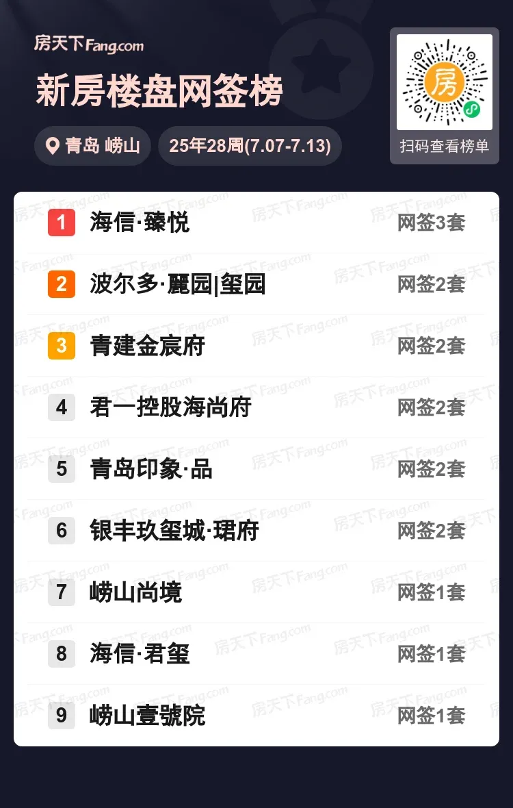 崂山楼市再现抢跑迹象!2025年7月第二周最新数据显示,海信·臻悦以3套成交登顶区域榜首,波尔多双盘与青建金宸府等5个项目以2套成交并列第二梯队。值得关注的是,高端改善盘银丰玖玺城·珺府与崂山尚境等品质项目持续保持成交活性,印证市场对优质资产的追捧。预测随着主城核心区土地资源日益稀缺,崂山高净值人群聚集区的改善型项目或将持续释放价值潜力。说说你最看好的潜力板块?