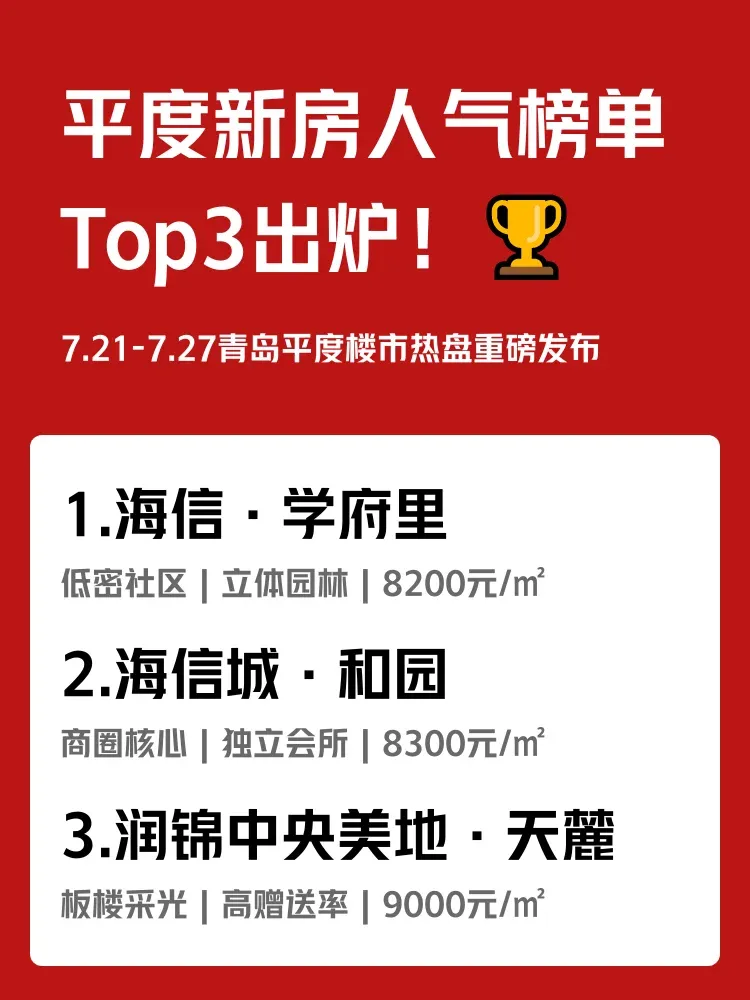 青岛平度上周(7.21-7.27)新房人气榜单出炉!前三名总评分破千🔥 每日奔波30公里上班 vs 家门口就是商圈,你会如何选择?