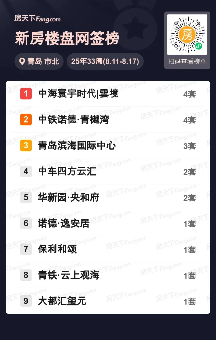 青岛滨海国际中心以3套成绩稳居第三,中车四方云汇和央和府各斩获2套成交并列第四梯队。值得关注的是,青樾湾、滨海国际中心等项目近期均推出景观楼王产品,市场反馈积极。