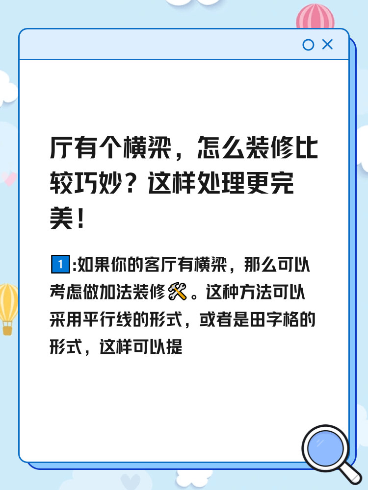 1️⃣️:如果你的客厅有横梁,那么可以考虑做加法装修🛠️。这种方法可以采用平行线的形式,或者是田字格的形式,这样可以提升装饰效果,让横梁变得更有造型,更具有艺术感觉🎨。