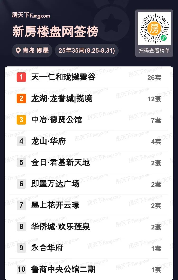 上周即墨楼市爆出亮点,天一仁和珑樾雲谷以26套网签量强势登顶,比第二名整整多出14套!龙湖·龙誉城|揽境以12套稳居第二,中冶·德贤公馆7套位列第三。目前市场呈现明显分化趋势,前三位楼盘已占据区域总成交量的75%。