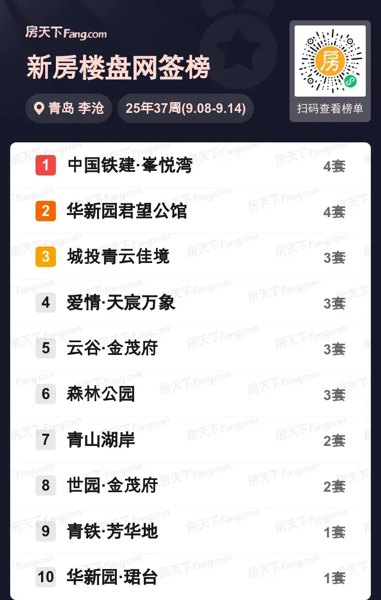 上周李沧新房市场看点十足!中国铁建·峯悦湾与华新园君望公馆以4套成交并列榜首,城投青云佳境等四盘以3套成交展开激烈追逐。从森林公园到世园·金茂府,上榜项目均展现出强劲的市场吸引力。