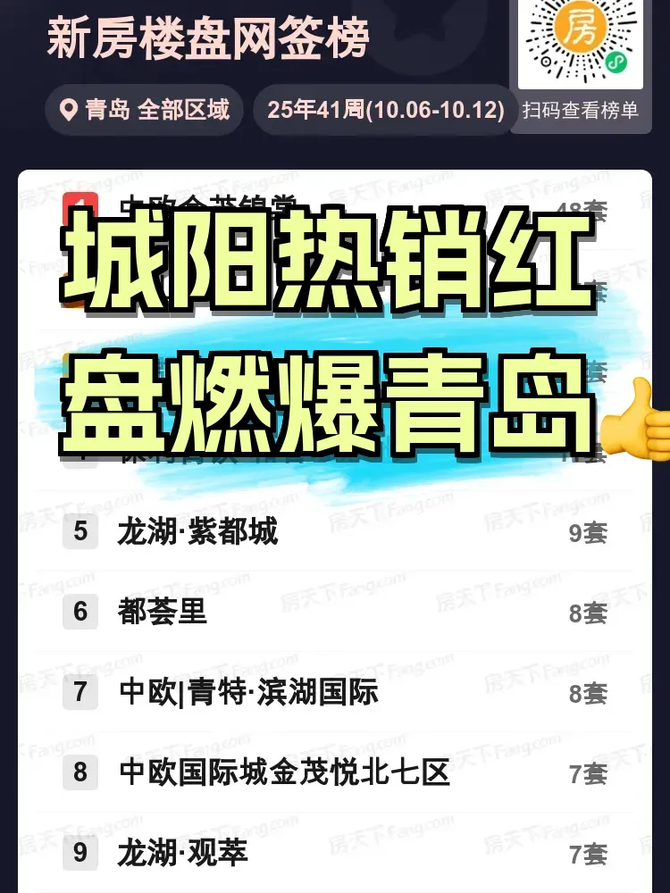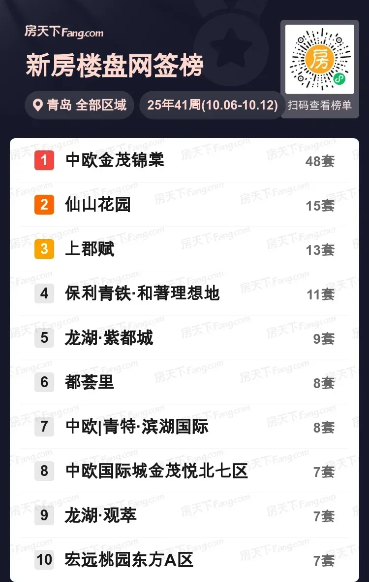 最新青岛楼市周报来啦!中欧金茂锦棠以48套成绩断层领先,几乎是第二名仙山花园的3倍。保利青铁、龙湖双子星表现稳健,7套成交的楼盘多达3个并列。数据背后透露出两个信号:一是城阳核心地段项目明显领跑,二是改善型产品开始进入发力期。大胆预测接下来会出现两极化市场,拥有学区/地铁等硬核配套的楼盘将持续突围。你最近在看哪个盘?欢迎交流踩盘心得~