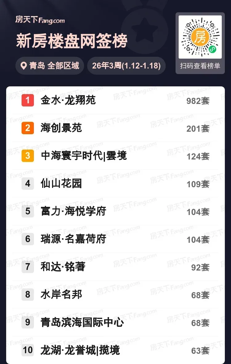 上周青岛楼市杀出一匹黑马!金水·龙翔苑以982套成交一骑绝尘,相当于第二至第四名成交总和的三倍多!榜单前六名均突破百套大关,海创景苑201套、中海寰宇时代|雲境124套紧随其后。值得关注的是,前六名中有四盘集中在西海岸板块,该区域已成为购房新焦点。从成交数据看,改善型项目和学区资源楼盘仍占主导。伴随年末置业潮到来,核心区优质楼盘成交势头或将持续火热。你最近在看哪里的房子?欢迎评论区交流~