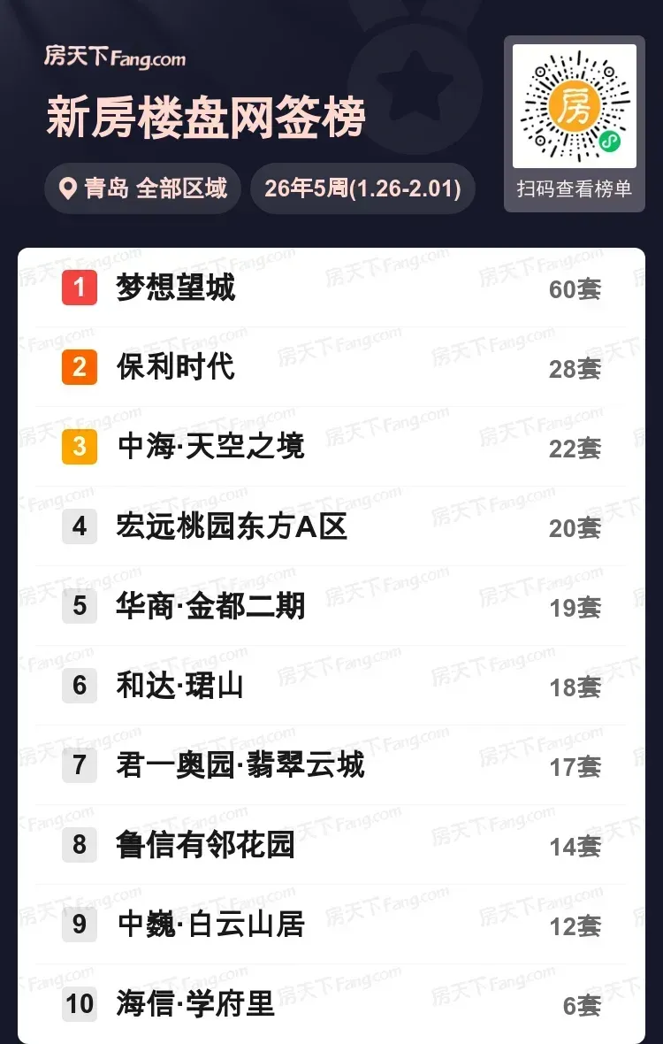 上周青岛楼市杀出超级爆款!梦想望城单周狂签60套,成交数据碾压式登顶,比第二名保利时代高出整整一倍多!天空之境、桃园东方等改善盘持续发力,前十榜单半数项目成交量集中在15-20套区间。从区域分布看,城央品质盘和新兴板块项目分庭抗礼。值得注意的是,榜单尾部出现断档式落差,前九名都在12套以上,第十名却仅有6套成交。预计随着改善需求持续释放,核心区拥有优质配套的项目将继续主导市场风向。你最近在看哪些盘?评论区蹲一波真实体验分享!