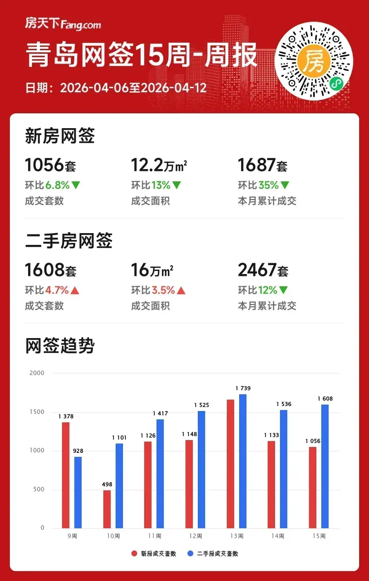 本周青岛楼市有点“冰火两重天”呢!✨ 整体来看,新房市场小幅调整,二手房则展现暖意。具体数据:2026年4月6日至12日,新房成交1056套,二手房成交1608套,一起来挖挖细节吧!