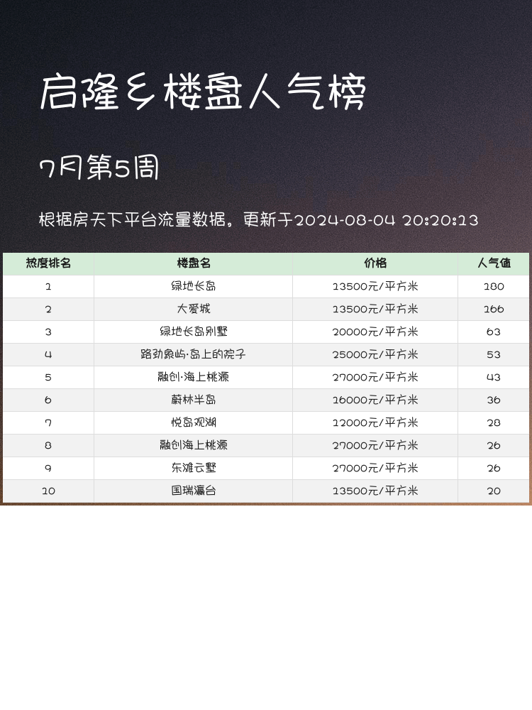 买房是人生大事,选择一个人气楼盘不仅要看价格,还要看配套、户型、交通等多方面因素。当前市场选房的核心逻辑在于综合考虑各个方面的优势和劣势,助您找到最合适的家🏠。今天带大家看看启隆乡的人气楼盘榜单,提供一些实用信息。