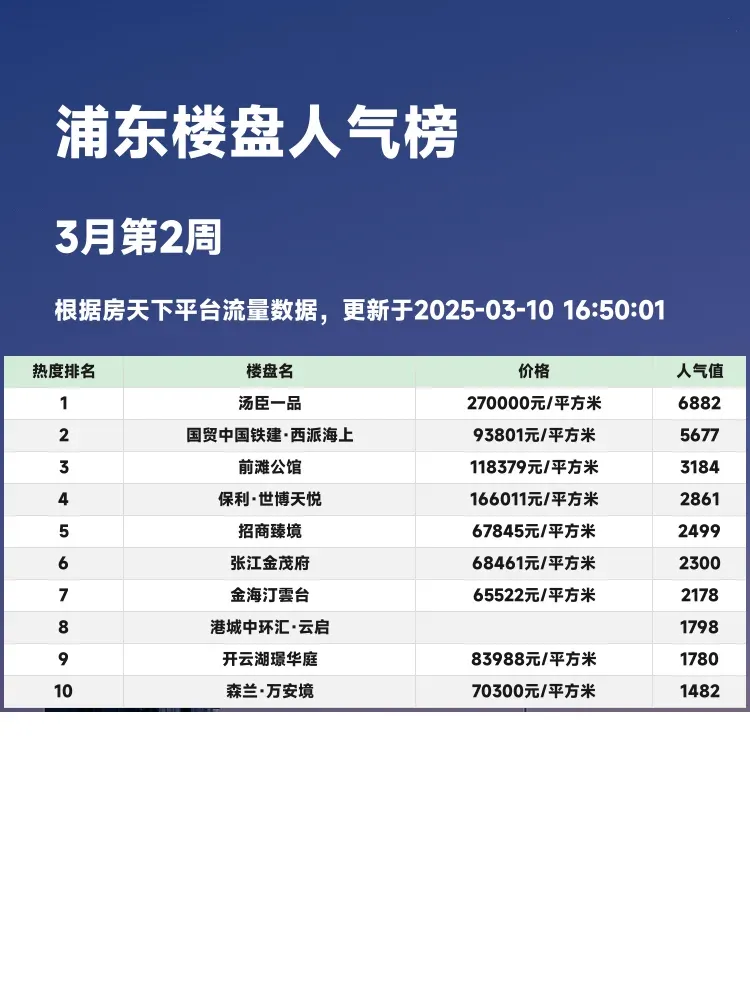 在买房选房时,关注人气楼盘榜单至关重要!🌟 当前市场,购房者更注重地段、配套和性价比,榜单能帮你快速锁定优质房源,避免踩坑。今天就来揭秘浦东最新人气楼盘榜单,看看哪些楼盘值得入手!👇
