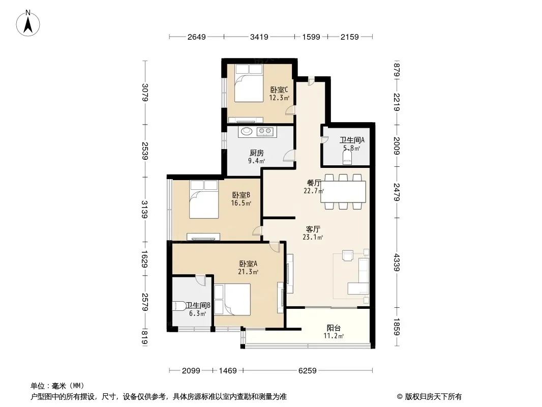 89㎡三房两卫,每个空间都像被尺子量过:主卧放完床还有1米过道,卫生间干湿分离不局促。最惊喜的是餐厅开间2.7米,六人餐桌+餐边柜毫无压力。