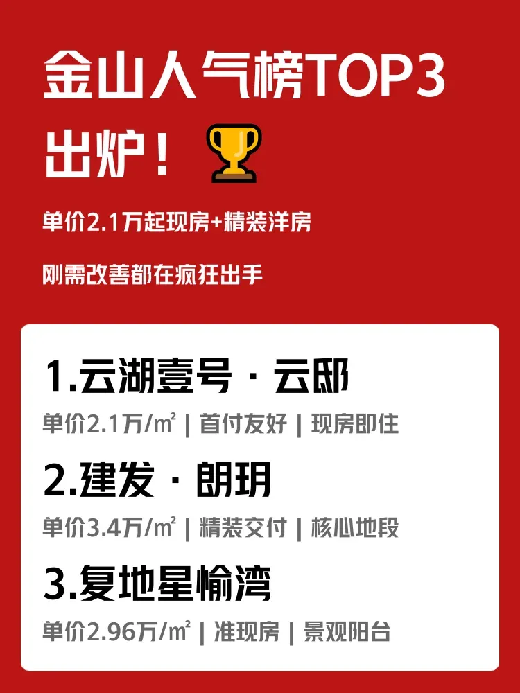 🔥刚出炉的金山新房人气榜(6.30-7.6)太有意思了!单价2.1万起的现房和3.4万的精装洋房同时挤进前三,刚需和改善需求都在疯狂出手...