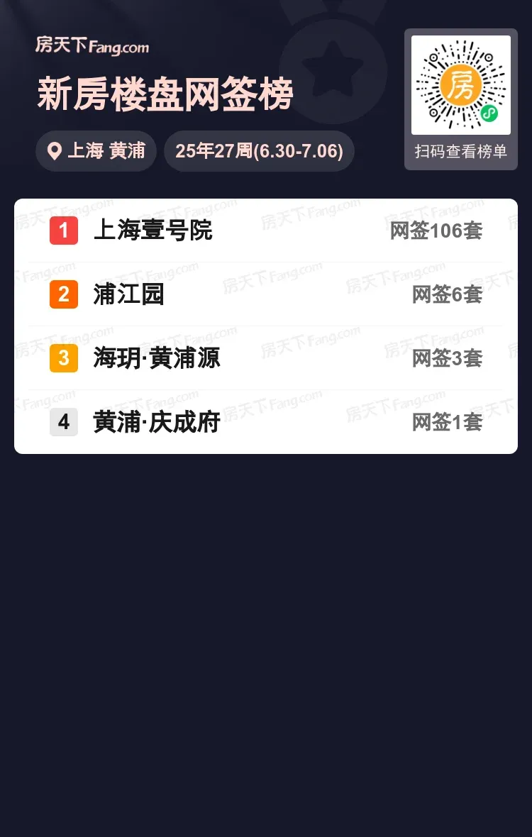 上海壹号院以106套成交刷新区域纪录,相当于后九名总量的9倍!这个位于黄浦核心的豪宅项目,用亮眼数据证明地段价值。浦江园6套签约量位居次席,海玥·黄浦源和黄浦·庆成府各成交3套和1套。