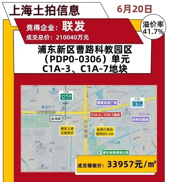 家人们,大消息📣 联发在上海浦东曹路成功拿下新地块,就在曹路科教园区(PDP0 - 0306)单元C1A - 3、C1A - 7地块!这次土拍竞争超激烈,四家实力房企疯狂举牌,经过67轮竞价达到中止价,溢价率直接飙到40%,最终联发以21亿元拿下,溢价率高达41.68%,这可是上海集中供地以来溢价率最高的地块,直接成了曹路新地王!