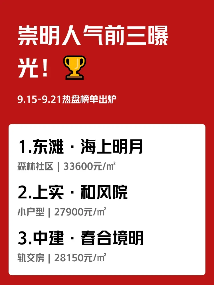 (传送门emoji)上周(9.15-9.21)崇明新房市场杀疯了!陈家镇和崇明新城两大商圈包揽TOP3,现场销售忙到没时间吃饭...早出晚归挤地铁 vs 推开窗就是森林氧吧,年轻人的选择正在改变!