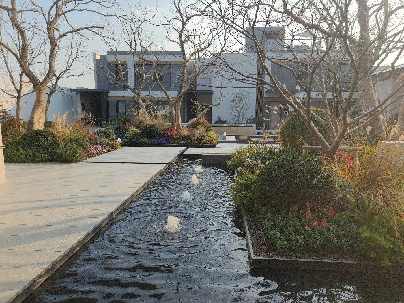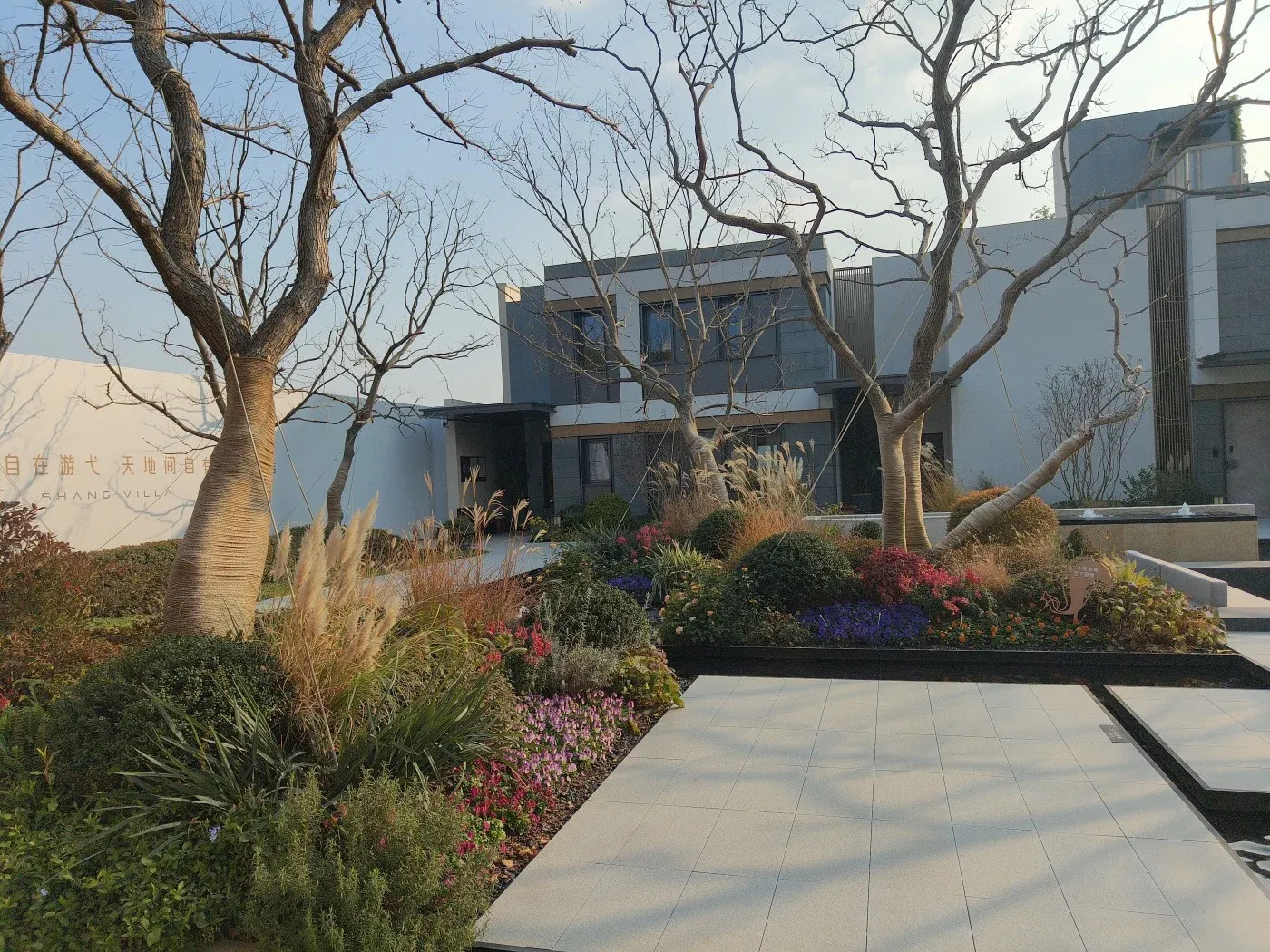 4. 35%绿化率搭配现代建筑风格,社区内部景观设计偏重自然感,现场可见乔木栽植。
