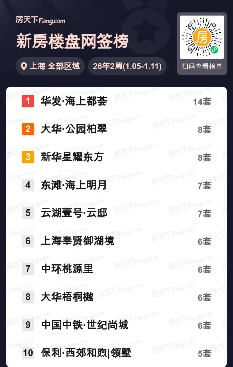 上周上海新房市场持续发力,华发·海上都荟以14套成交强势登顶,成为置业者重点关注对象。大华·公园柏翠与新华星耀东方各成交8套并列第二梯队,东滩·海上明月、云湖壹号·云邸紧随其后。值得关注的是,中环及郊环项目持续发力,中环桃源里、上海奉贤御湖境等6套成交项目占据半数席位,显示购房者选择趋于多元化。