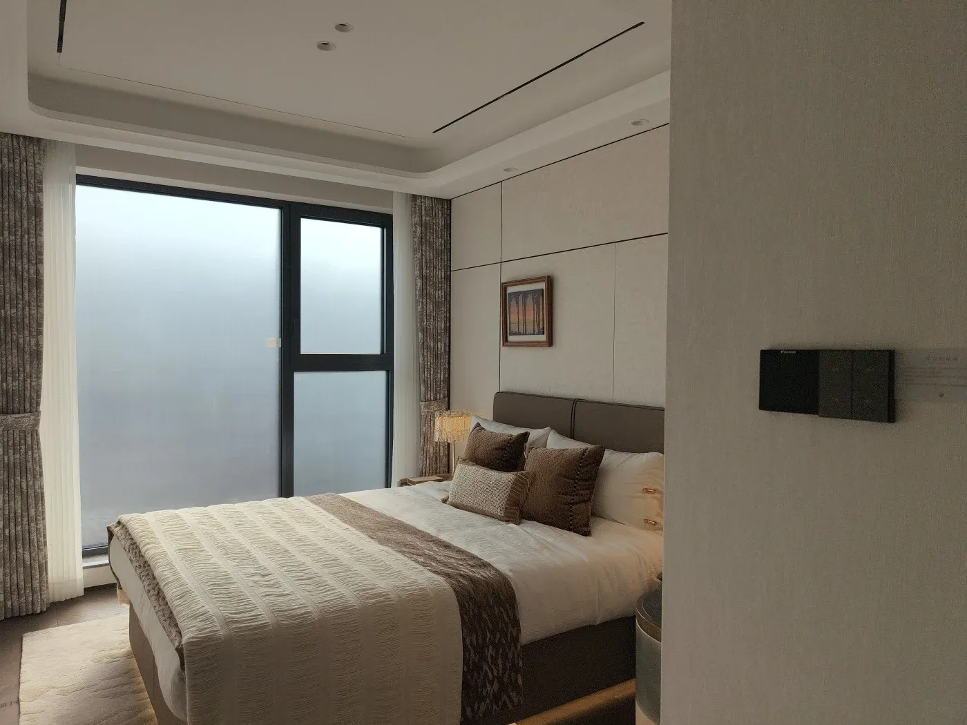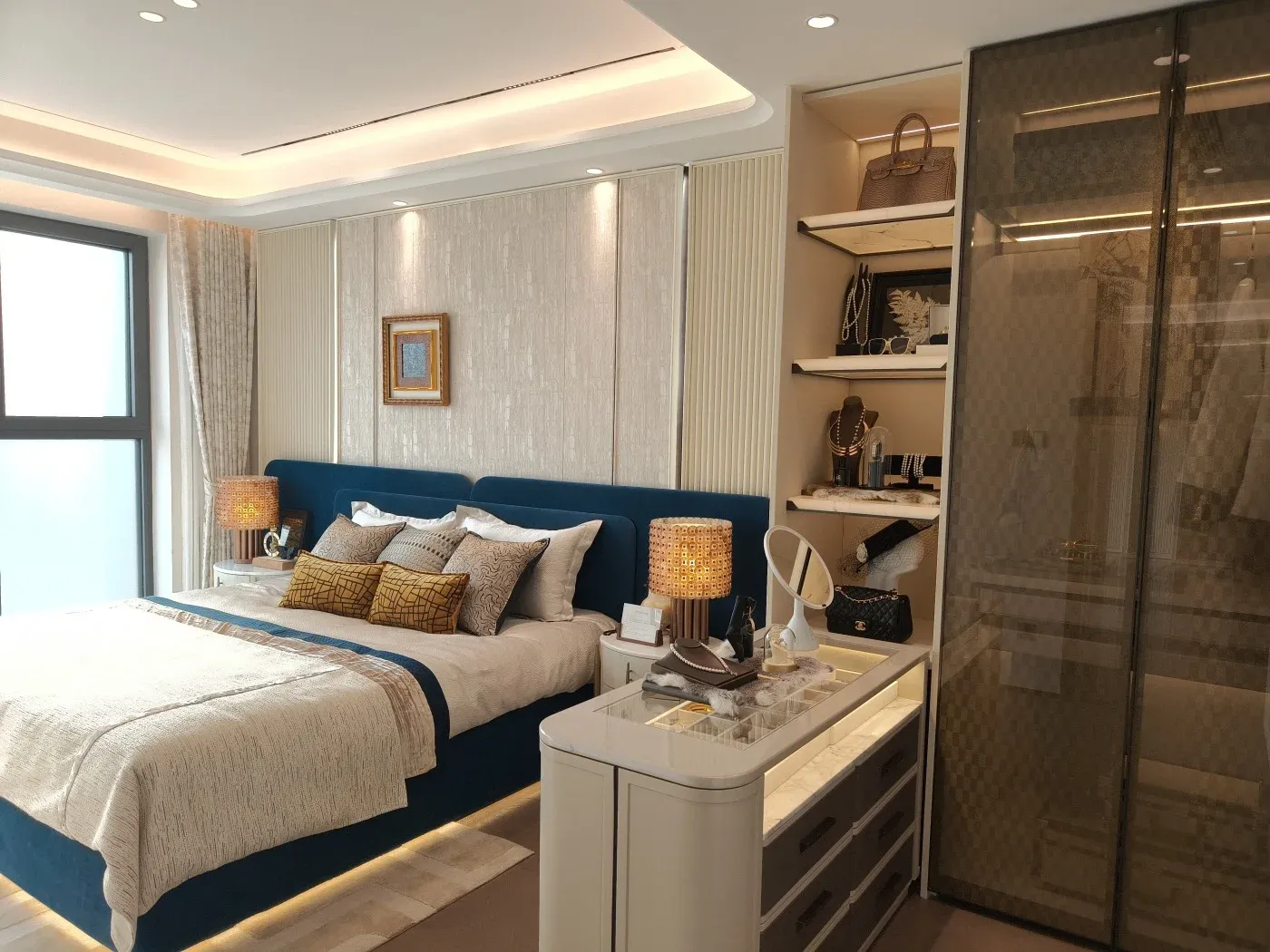108户型主卧,连通阳台后,整体空间感媲美130㎡大三房的主卧尺度,在放置1.8米大床+双床头柜后,还能定制一个大尺寸L型衣柜。