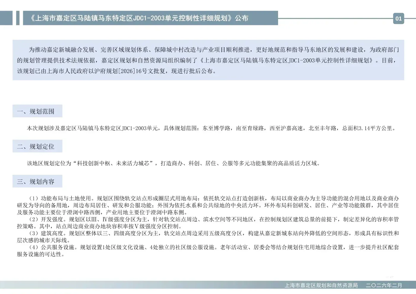 《上海市嘉定区马陆镇马东特定区JDC1-2003单元控制性详细规划》规划公布